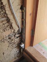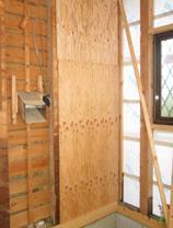 土台、梁、桁と柱の接合部を耐震用金物で補強。強度アップとバランスをとるために壁も補強しています。