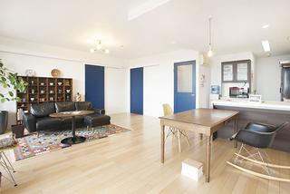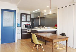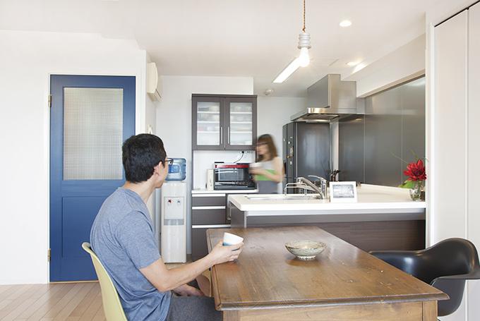 アクセントにはご夫婦で厳選した深みのあるブルーのオリジナル建具を設え、個性的な空間に仕上がっています。