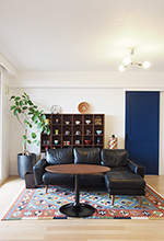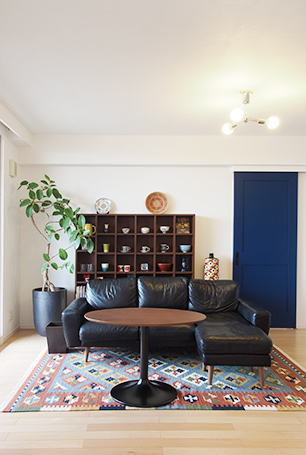 お気に入りのレザーソファとキリムが映えるリビング。グリッドスタイルのオープンシェルフには、奥様のご趣味である陶芸コレクションがおしゃれに飾られています。