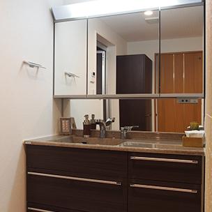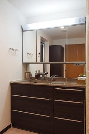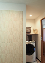 L字型の洗面スペースは、身支度をする洗面化粧台と洗濯機とが離れているので、以前より使い勝手がよくなっています。壁面は調湿効果のあるエコカラットを。