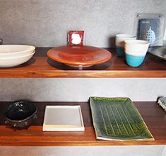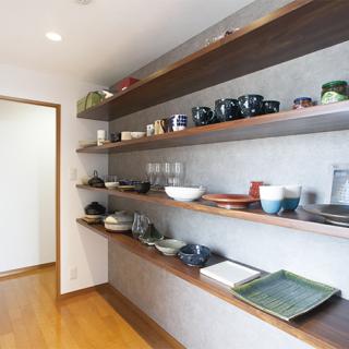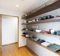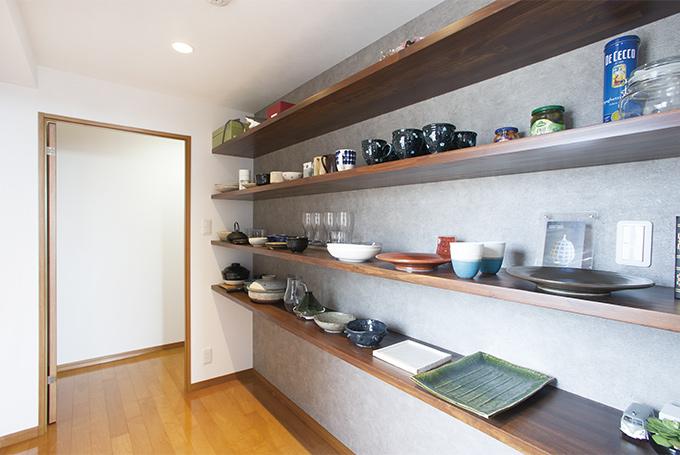 パントリーは各地で買い集めた食器の他、奥様の陶芸作品も並ぶギャラリーのような空間。背面はコンクリート風壁紙をチョイス。普段使いでも使用するため、「お料理に合わせてどんな器が似合うか考えるのが楽しい」とのこと。
