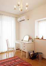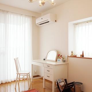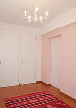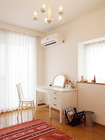 ホワイト×ピンクでコーディネートした寝室は、お手持ちのドレッサーや照明と相性抜群。 LDKとの間の建具は、寝室側は薄いピンクに、LDK側はブルーに塗り分けています。