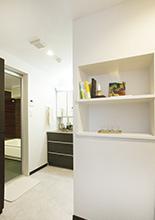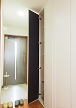 ユニットバスと廊下との間のスペースを有効活用して玄関前には収納を造作。
