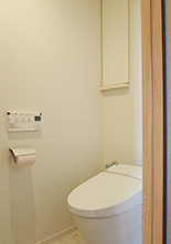 LDKの飾り棚を解体し壁を移動して、タンクレスのトイレ(LIXIL サティス)に変えて奥行が広がったトイレ。正面は壁一面、調湿機能のあるエコカラットに。