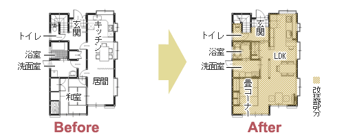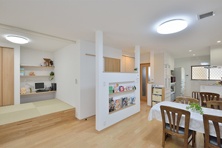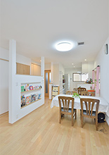 6人家族が一緒のLDKに居ても、窮屈にならないよう廊下と和室をLDKに取り込みスペースを拡張。広くなっても冬は暖かく空気を汚すことなく過ごせる床暖房も設置。どこにいても家族の温もりを感じれる二世帯リフォームです。