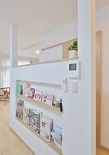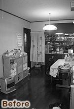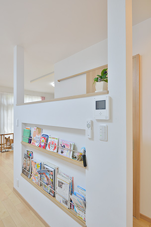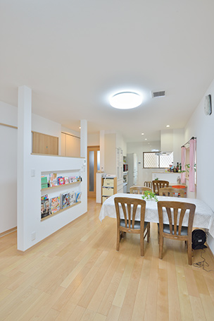 和室と廊下を無くし、ワンルームのLDKに。洗面室前の構造上残ってしまう柱2本を利用して、お孫さんの絵本や雑誌が置けるマガジンラックを造作。ダイニングから洗面室が直接見えないようにとパーテーション代わりにもなっています。