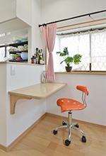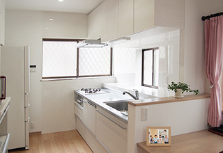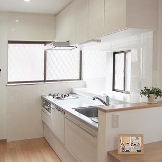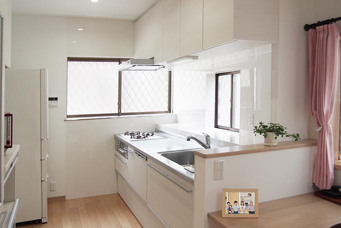 キッチンは当初、対面型を希望されていましたが、親子で立っても動きやすく、キッチン家電や食器も使いやすいという事でI型(クリナップ ラクエラ)をチョイス。調理中でもお子様とコミュニケーションがとれるサイドカウンターや、キッチン正面には窓台を広げて仮置きに便利なスペースを設けています。