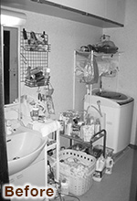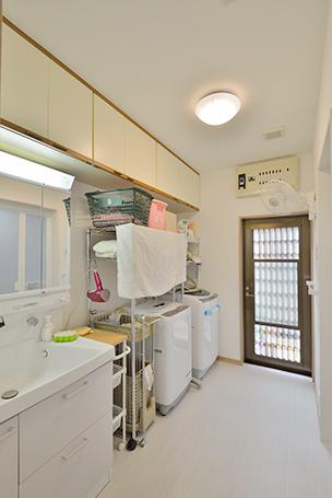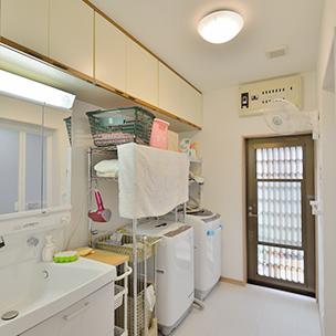 洗面は家族6人のバス&サニタリーグッズがしっかり収まるTOTOサクア。洗濯機が2台置けるようになり、二世帯分の洗濯もラクラクです。