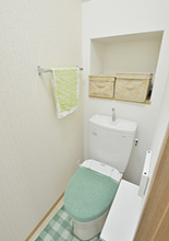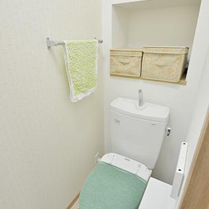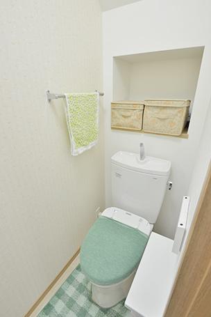背面にはトイレットペーパーやタオル、お掃除アイテムが収納できるようニッチを造作しています。