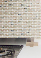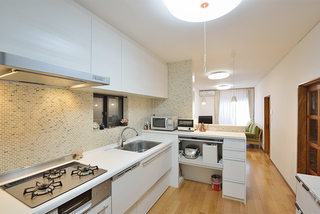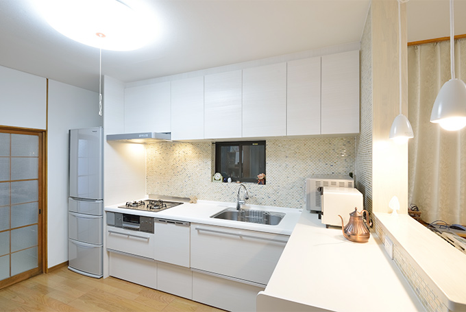キッチンとダイニングの境になっていた壁は、耐震性に関わる部分を除いて撤去し、一体感と採光性をアップ!キッチン前のタイル壁やリビングの家具は、デザインを学ばれている娘さんがコーディネート。