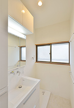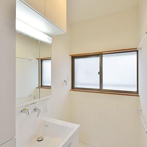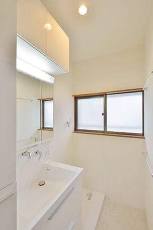 洗面はシャキッとスタイリッシュで清潔感もあるTOTO(オクターブ)。ウォールキャビネットやサイド収納も設え、以前より収納力アップ!