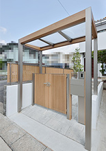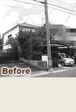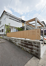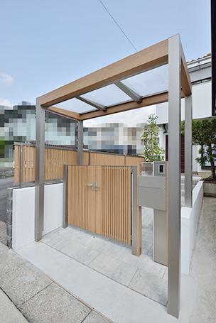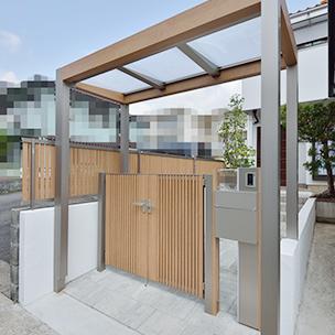 育ちすぎて日差しを遮っていた植栽は必要ものだけ残し、代わりにウッド調の目かくしフェンスを新設。門柱や門扉はフェンスに合わせたデザインで統一しています。