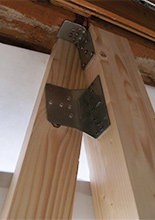 雨漏りで弱っていた1Fの壁補強に加え、柱の金物補強で耐震評価を1.0以上まで引き上げています。