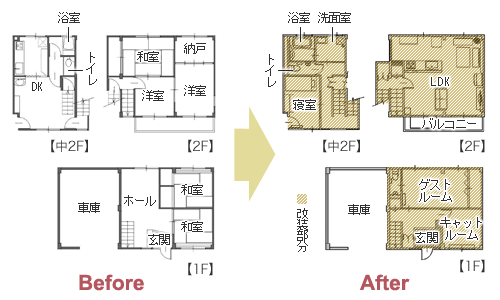 | リフォーム箇所 | 1F(トイレ、玄関、ゲストルーム、キャットルーム)、中2F(トイレ、洗面室、浴室、寝室)、2F(リビング、ダイニング、キッチン)、階段、床暖房 |