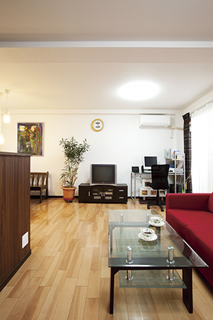 洋室2部屋と和室・納戸の仕切りとすべて取り払うことで、お孫さんが遊びに来ても走り回れる広々LDKに。全面に床暖房が入っていて真冬でも快適に過ごせます。ダイニングに飾られている油絵はご主人の作品。「今はお守りとして飾っています。」