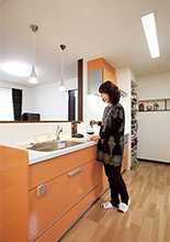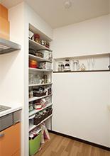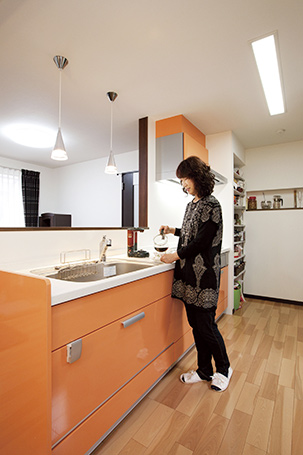 奥様念願の対面キッチンは「家事をしながら家族と会話ができる」とお気に入りの空間。リビングから目かくしの位置になるキッチン横には、ストック品や小物が置ける収納棚を造作。