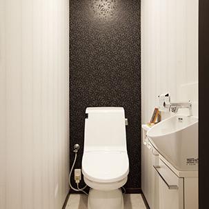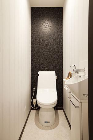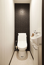 1、2Fともに節水タイプのLIXIL(アメージュZ)に取替え。一面をシックなクロスでアクセントに。手洗器も取り付けています。