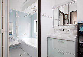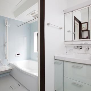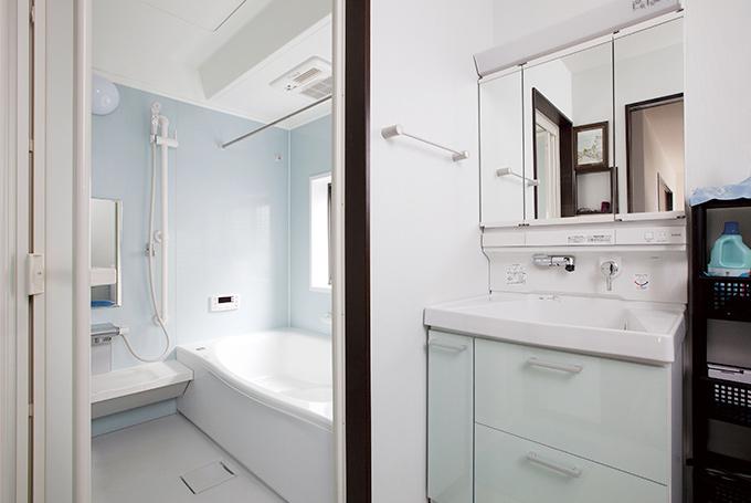 間取り変更でゆったりサイズに生まれ変わったお風呂はTOTO(サザナ)。収納が充実した洗面室も合わせて新設。お孫さんが泊まりにきた時はいっしょにお風呂を楽しめます。