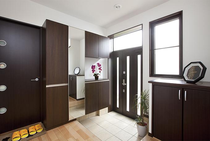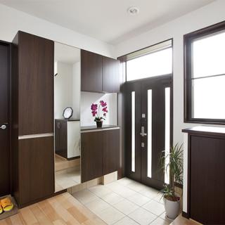 広すぎて活用できていなかったエントランスホールは適度に縮小。玄関収納は靴の他、猫ちゃん用品が仕舞えるよう大きめに作っています。