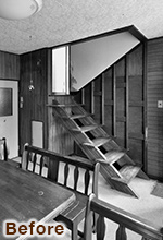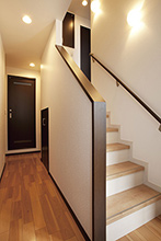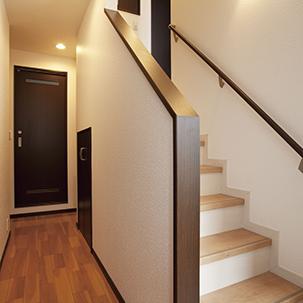 ストリップ階段で手すりもなく危なかった階段は、手すりを取付け安全性をアップ!階段下は無駄なく収納にしています。