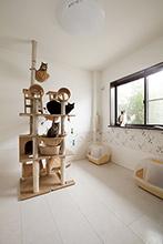1Fの和室1部屋を猫ちゃん専用のキャットルームに。以前は住み分けができておらず、住まい全体にニオイが漂っていましたが解消。日差しが気持よく猫ちゃんたちもご機嫌です。