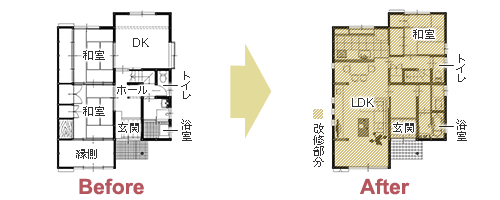 | リフォーム箇所 | リビング、ダイニング、キッチン、洗面室、トイレ、浴室、玄関、和室、外壁、屋根 |