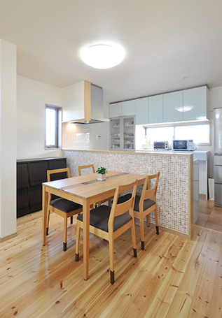 和室2間と縁側がつながり南北に広くなったLDK。床は北欧レッドパインを使用した無垢フローリング。キッチン腰壁は茶系のモザイクタイルでナチュラルな印象に。