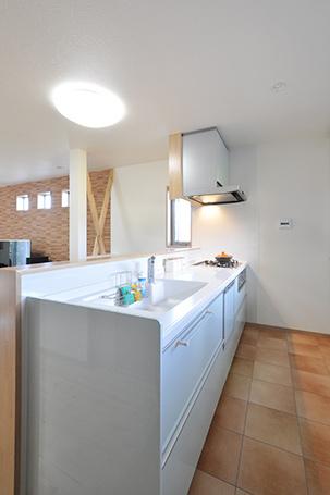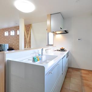 明るくなったリビングと一体感が増すようにキッチンは、レンジフードの背面以外に垂壁をなくして開放的に。