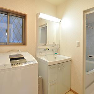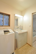 階段の登り口とトイレの場所を移動することで、スペースが広がった洗面室。化粧台は収納力があり、お掃除も楽なTOTO(サクア)に交換しています。