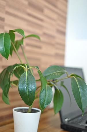 構造上残ってしまう筋交いの幅を利用してテレビボードとPCカウンターを造作。背面の壁は羽目板風のクロスでアクセント。