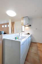 床にはテラコッタ調のタイルを敷き詰め、カフェのようなおしゃれな空間を演出します。