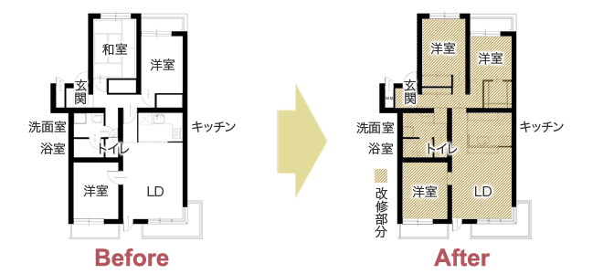 | リフォーム箇所 | リビング、ダイニング、キッチン、お風呂、洗面室、トイレ、玄関、洋室 |