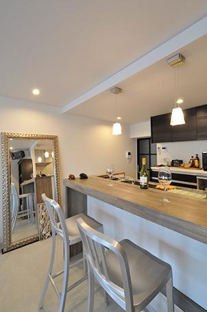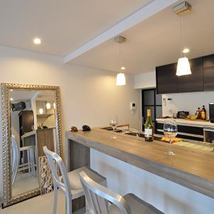 キッチン側面の壁を取り除き開放的になったリビングダイニング。シンプルな内装にゆったりと配したこだわりの家具や大きく重厚感のある姿鏡が、高級感を演出してくれます。