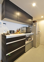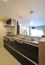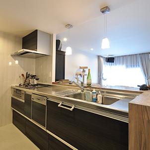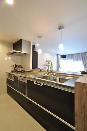 壁付け型からあこがれの対面型キッチンへ。システムキッチン(クリナップ/ ラクエラ)は、高級感をグッと引き立ててくれるダークウッドを選択。背面の食器棚も同じパネルで統一しています。