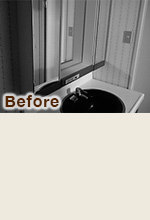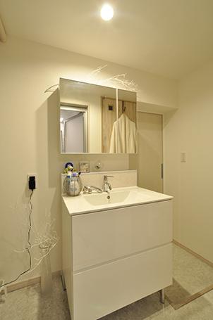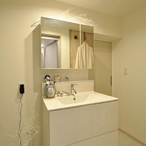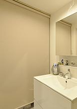 洗面はスタイリッシュなデザインが人気のサンワカンパニー/リンド・ツーに、中が収納になっているミラーボックスを組み合わせて、ホテルライクな雰囲気に。壁面収納はロールカーテンで目かくしできます。