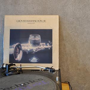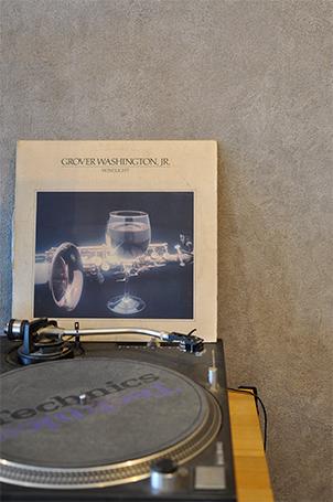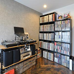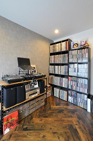 ターンテーブルがあったり、棚にぎっしりとレコードが並ぶお部屋はご主人の趣味部屋。インパクトのある床は、2種類のフロアタイルをヘリンボーン張りして仕上げています。