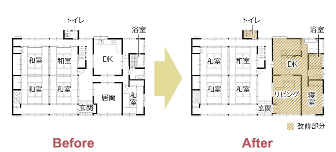 | リフォーム箇所 | リビング、ダイニング、キッチン、お風呂、洗面室、トイレ、玄関ホール、寝室 |