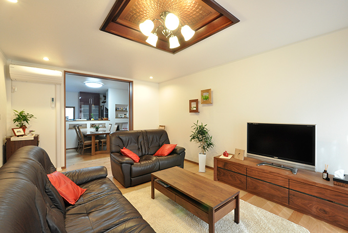 廊下分スペースが広くなり、ダイニングキッチンとの一体感も増したリビング。壁は白系のクロスを上張りすることでさらに広く明るく感じられます。インドアグリーンが配された木製フレームが部屋のアクセントになっています。