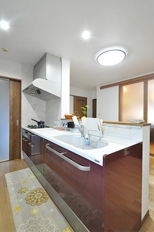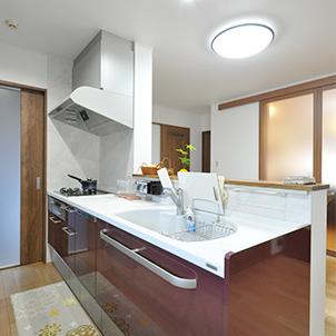 壁付け型から対面型に変更し、リビングと扉1枚でつながったことで、家族が身近に感じられるようになったキッチン。扉カラーは奥さまがショールームで一目惚れしたプライムレッド(トクラスBb)で統一。寒さと結露対策として窓は二重サッシ(インプラス)を設置しています。