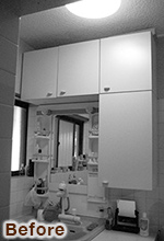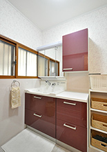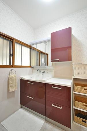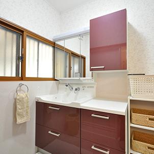 洗面化粧台は、キッチンの扉と同じ色味のトクラス/エポックに取替え。ダイニングとの間にあった廊下や入口の段差をなくすことで、バリアフリーにアクセスできます。窓も二重サッシ(インプラス)にして寒さ&結露対策を。