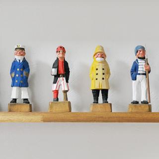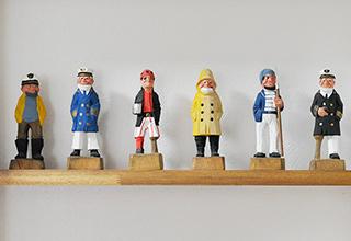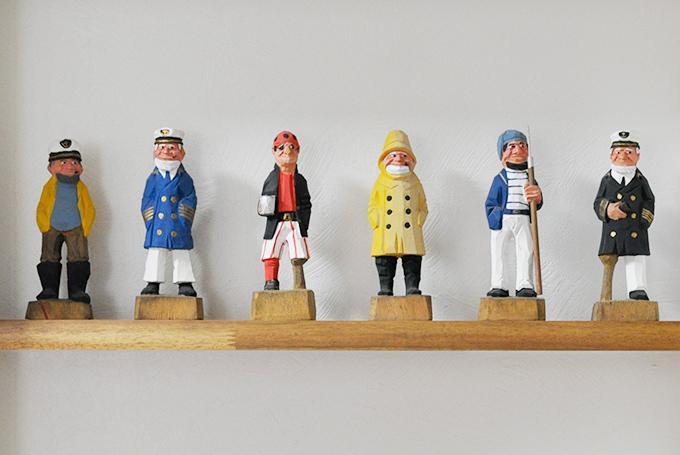 キッチン前の壁や腰壁にはニッチやマガジンラックを造作。右上部のニッチに飾られた表情豊かな6体の木彫人形が印象的です。