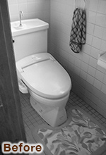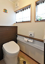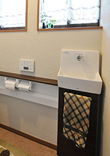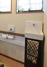 トイレは手洗器付きで背面にキャビネットがあるTOTO/レストパルを選択。床においていた掃除用具などが収納でき、掃除も楽々できます。入口の段差も解消。