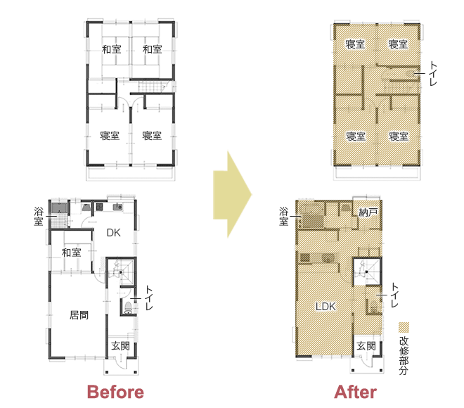 | リフォーム箇所 | 1F(リビング、ダイニング、キッチン、お風呂、洗面室、トイレ、納戸)、2F(寝室、トイレ)、床暖房 |
