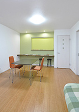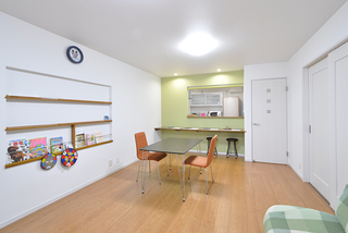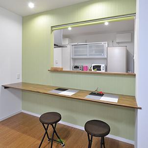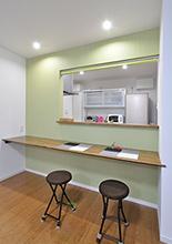 キッチンとの間の壁のみを淡いグリーンのクロスにしてアクセント。カウンターテーブルも造作。お孫さんが遊びに来た時はここで並んで、みんな一緒に食事をします。