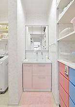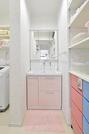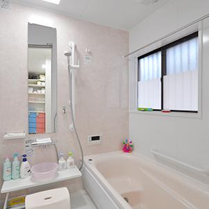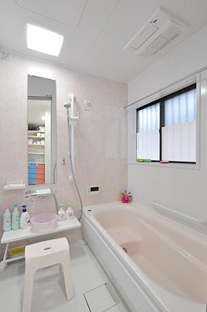 浴室は1坪にサイズを広げ、ピンク色の暖かい色合いのユニットバス(TOTO/サザナ/1616サイズ)に。