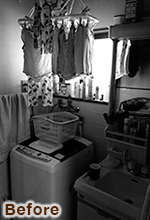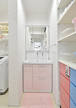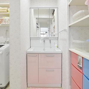 モノで溢れていた洗面脱衣室は、洗面化粧台(TOTO/サクア)と洗濯機をしっかりと分け、スッキリとした印象に。洗濯機の上部や洗面化粧台横には可動棚収納を造作しています。