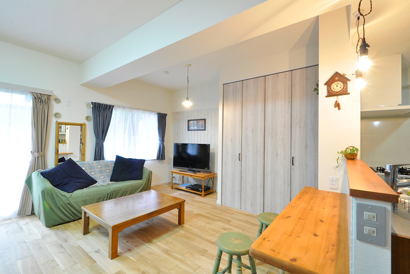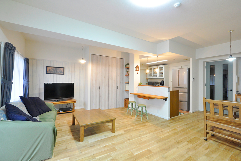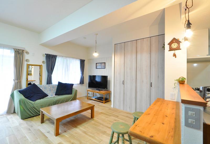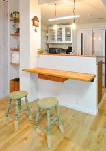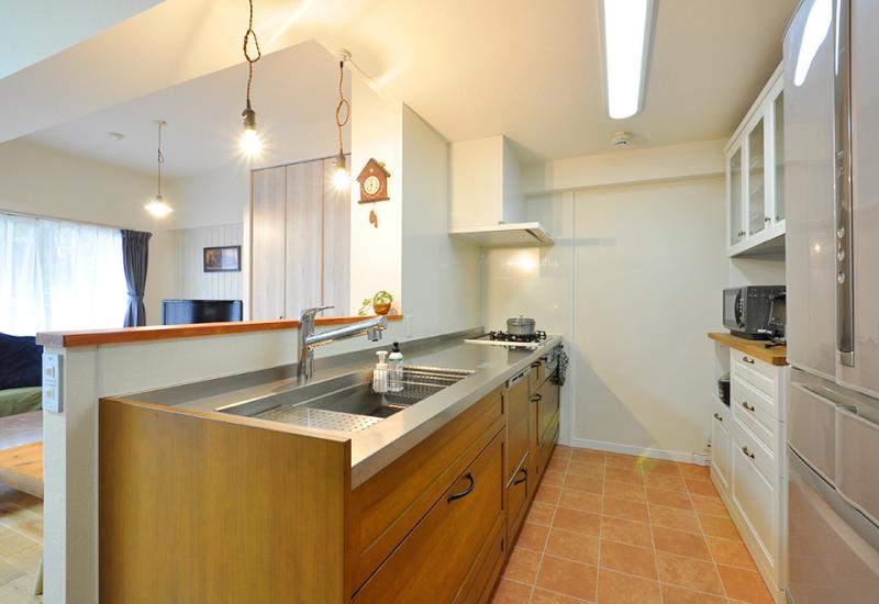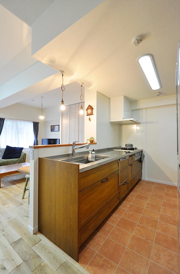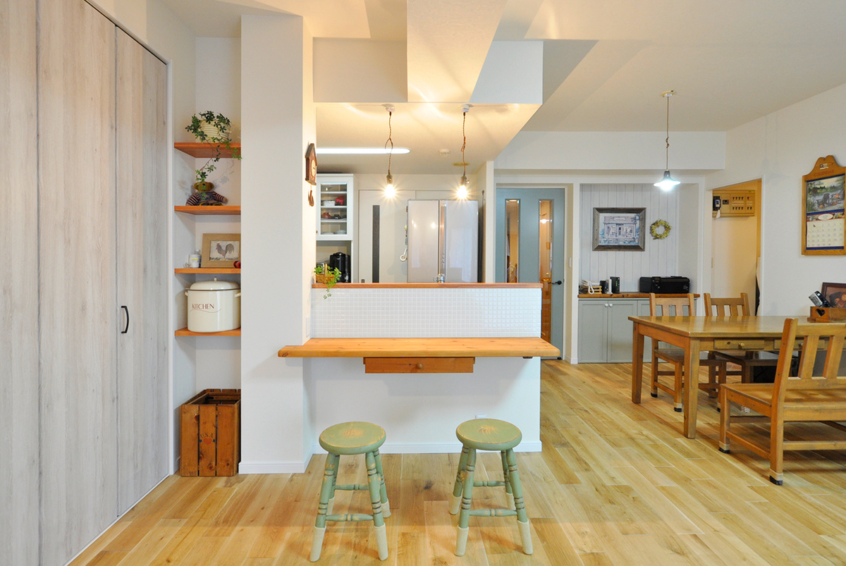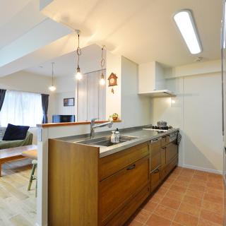 垂れ壁を撤去しリビングとオープンにつながることで、一体感と明るさが格段にアップ!木のぬくもりを感じるシステムキッチンはウッドワン/スイージー(I-2700)。LDKの家具と合わせて無垢のパイン材を選びました。テラコッタタイル調のクッションフロアとも相性ばっちりです。