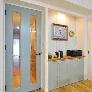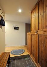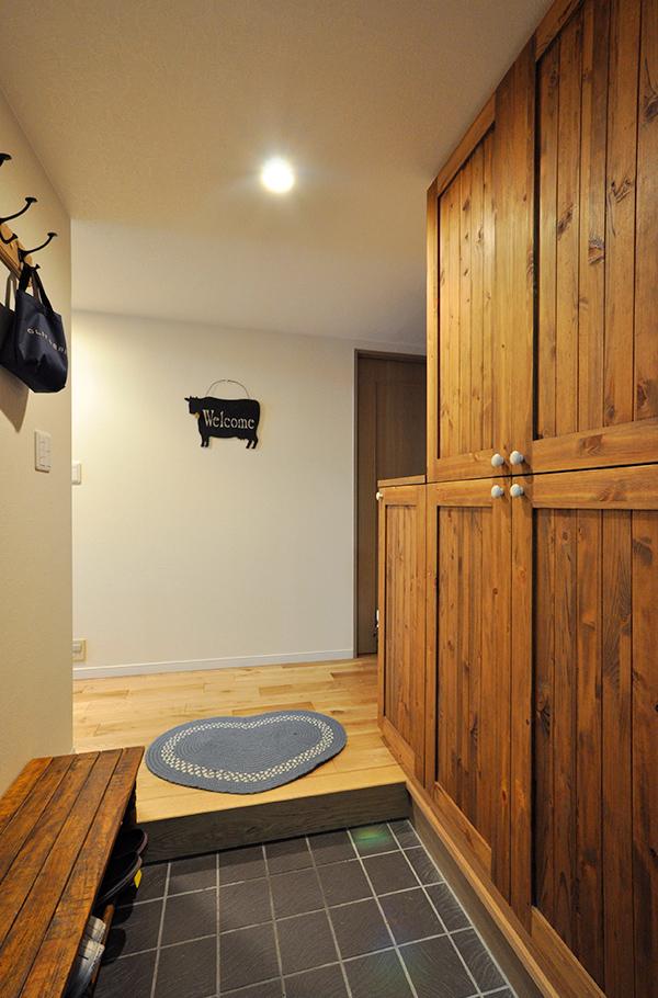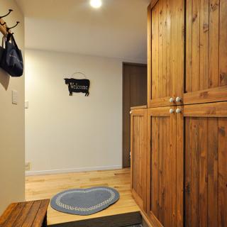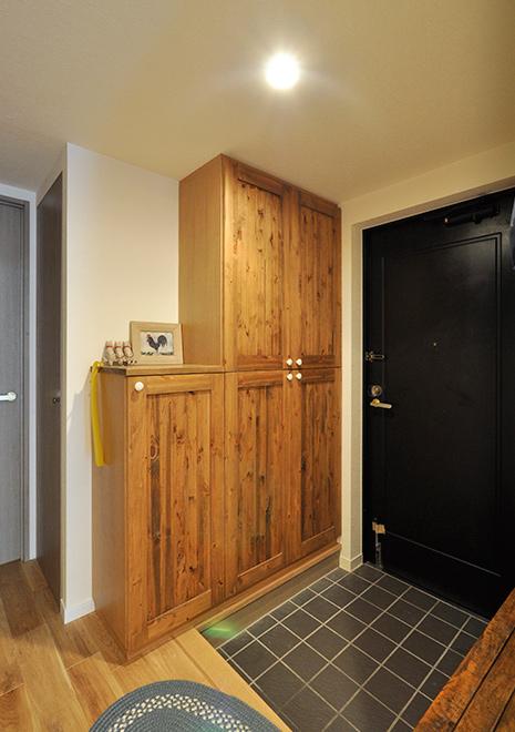 LDKと同じく無垢のラスティックオークで仕上げた玄関ホール。収納は向かい合わせにあるベンチの雰囲気と合わせて、節のあるパイン材を羽目板張りして造作しています。