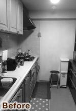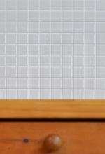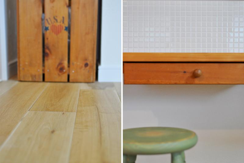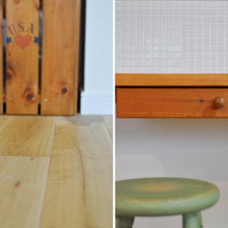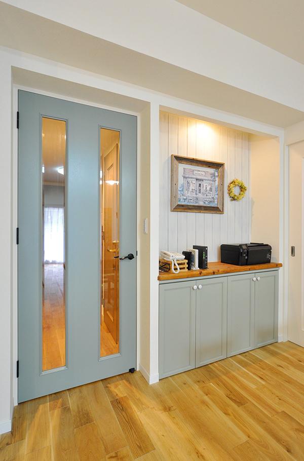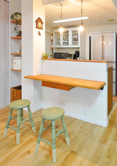 廃棄予定だったパイン材のダイニングテーブルは、半分にしてキッチン前のカウンターと電話台の天板にリメイク。電話台下の扉は淡いオリーブ色にペイントして、優しい風合いに仕上げました。キッチンの正面壁はモザイクタイルでアクセント。「本物だからこそ素材のアジを楽しみたい」と、あえて白タイルで設えました。