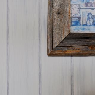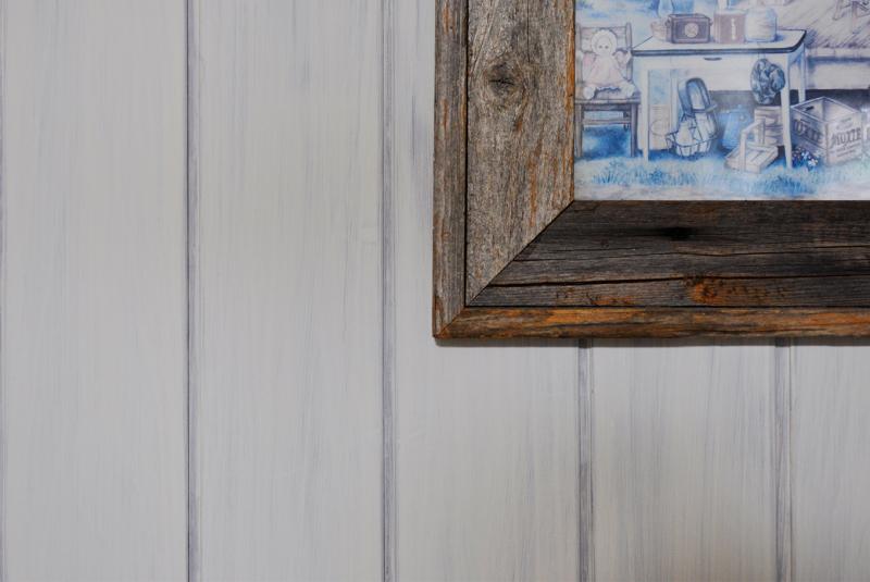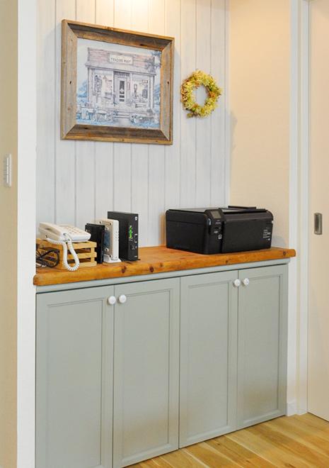 TVボードと電話台の壁面は、白く塗装した羽目板を張りアメリカンカントリー風にアレンジ。